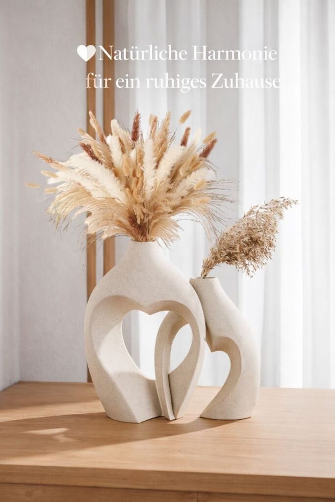 Mit Pampasgras, Trockenblumen oder feinen Zweigen dekoriert, verstärkt die Vase ihre weiche, wohnliche Wirkung. Gleichzeitig funktioniert sie auch ohne floralen Inhalt als stilles Wohnaccessoire, das dem Raum Struktur und Ruhe gibt. Ihre offene, fließende Form sorgt für visuelle Balance und unterstützt eine entspannte Atmosphäre.