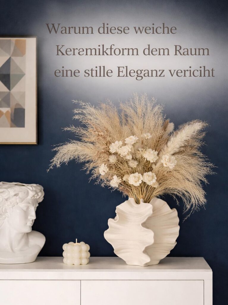 Diese Vase wirkt durch ihre weiche, fließende Kontur besonders ruhig und ausgewogen. Die sanften Übergänge der Keramikform verleihen dem Objekt eine natürliche Tiefe, die nicht auffällt, sondern trägt. Statt klarer Kanten entsteht eine ruhige Linienführung, die dem Raum eine stille Ordnung gibt.